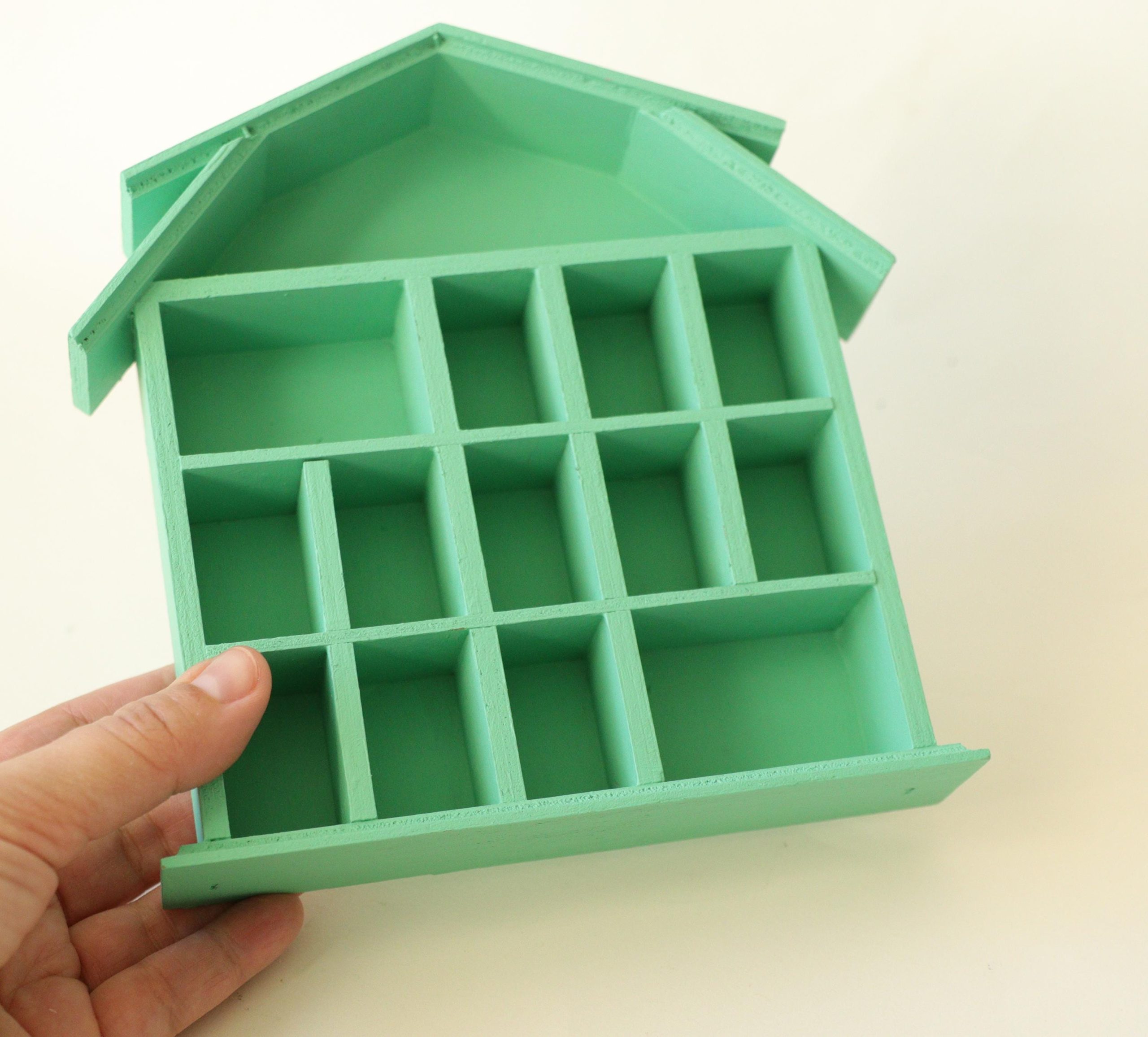 This wooden trinket house shelf has been painted by me with a jade green! Measures 7×7” and 1” deep.