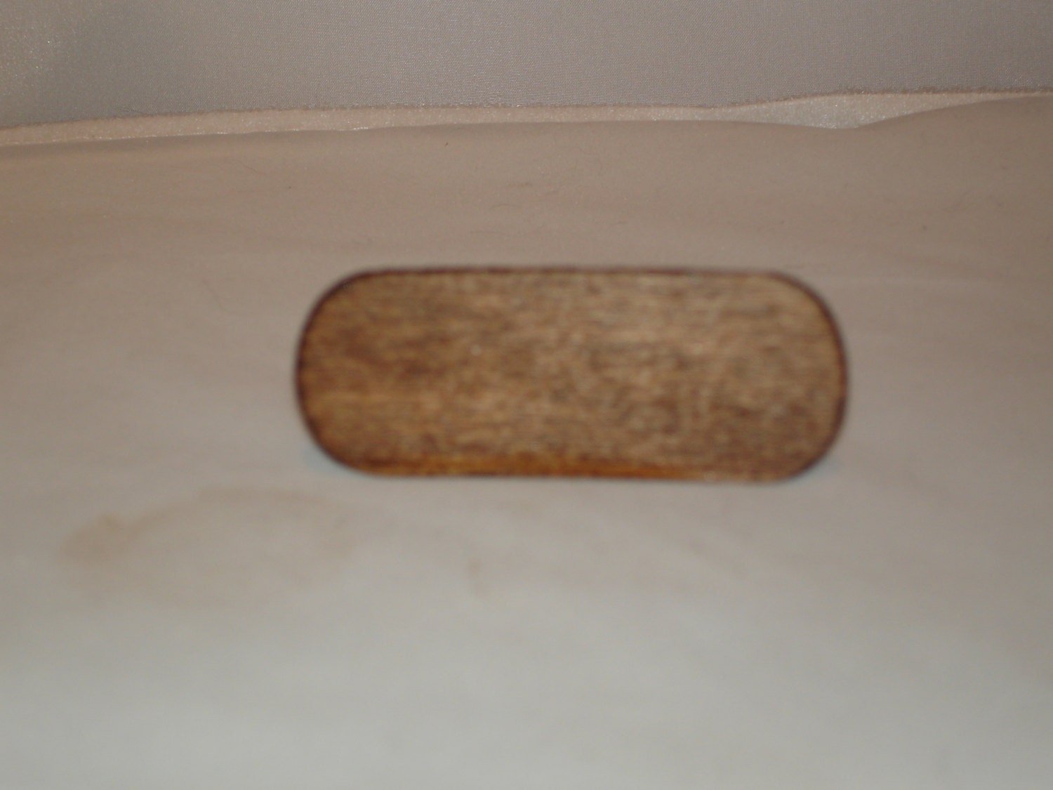 Oval dollhouse shelf, 2 and 5/8″ x 1″, finished with a dark cherry oak stain. Including the brackets, it is 1.25″ tall.