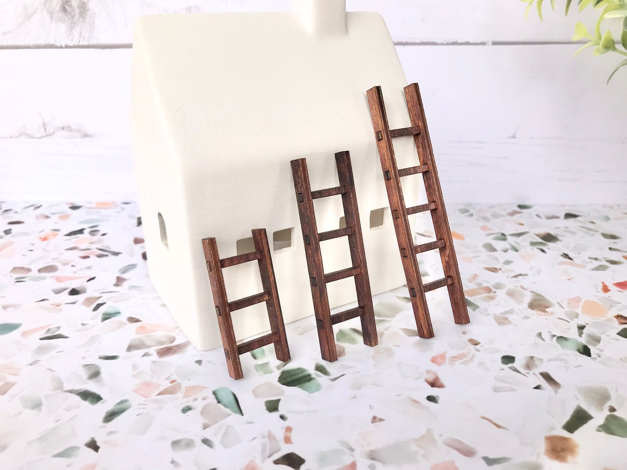 The Mossy Knoll’s unique handmade miniature farmhouse style ladders are the perfect addition to any window sill, planter, desk, shelf or tiered tray.